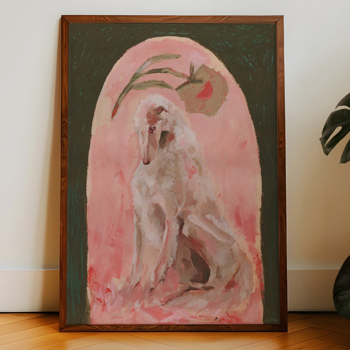 This beautiful mixed media painting portrays a solitary Borzoi, seemingly lost in thought. Using warm, earthy tones and expressive mark making, Cait, also known as the artist Unhinged Peach, captures the quiet, reflective mood of this introspective canine.