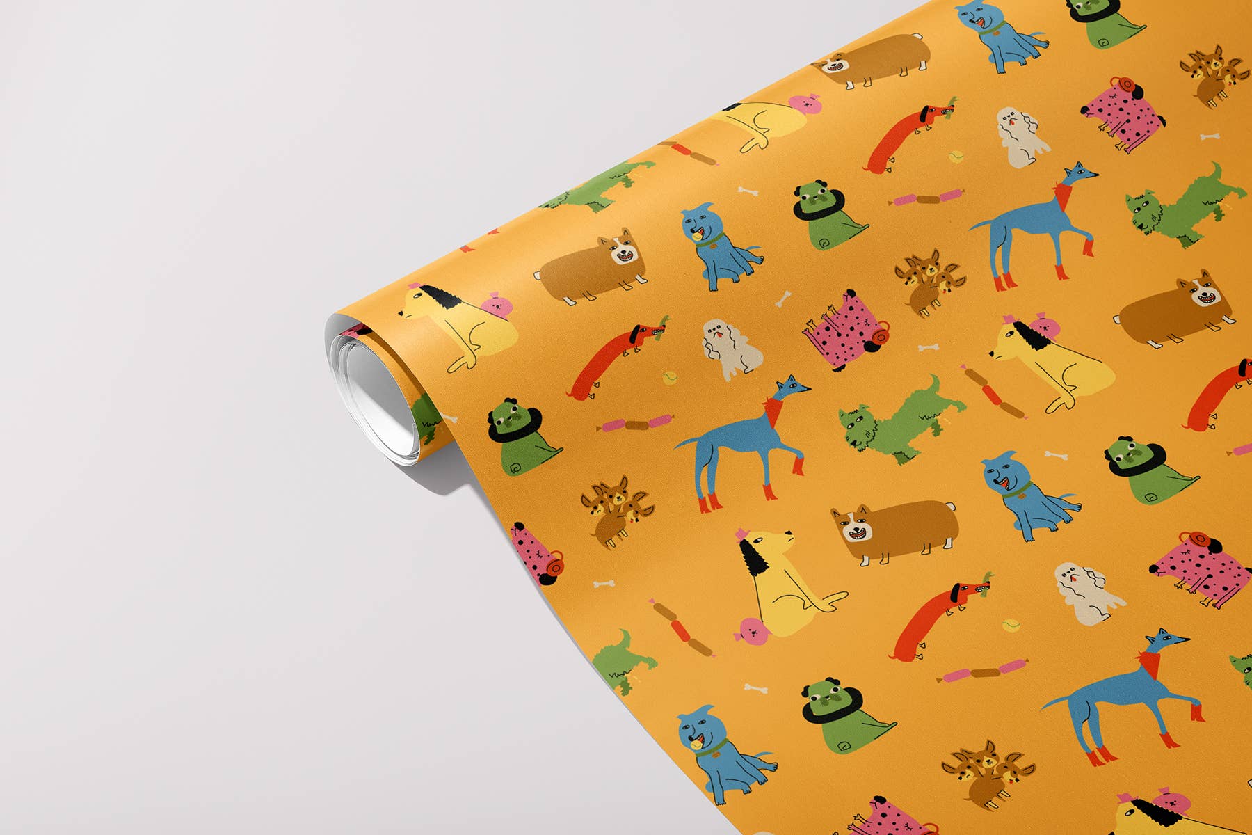 A collection of colourful canine characters on a yellow background. Gift wrap will be folded for postage.