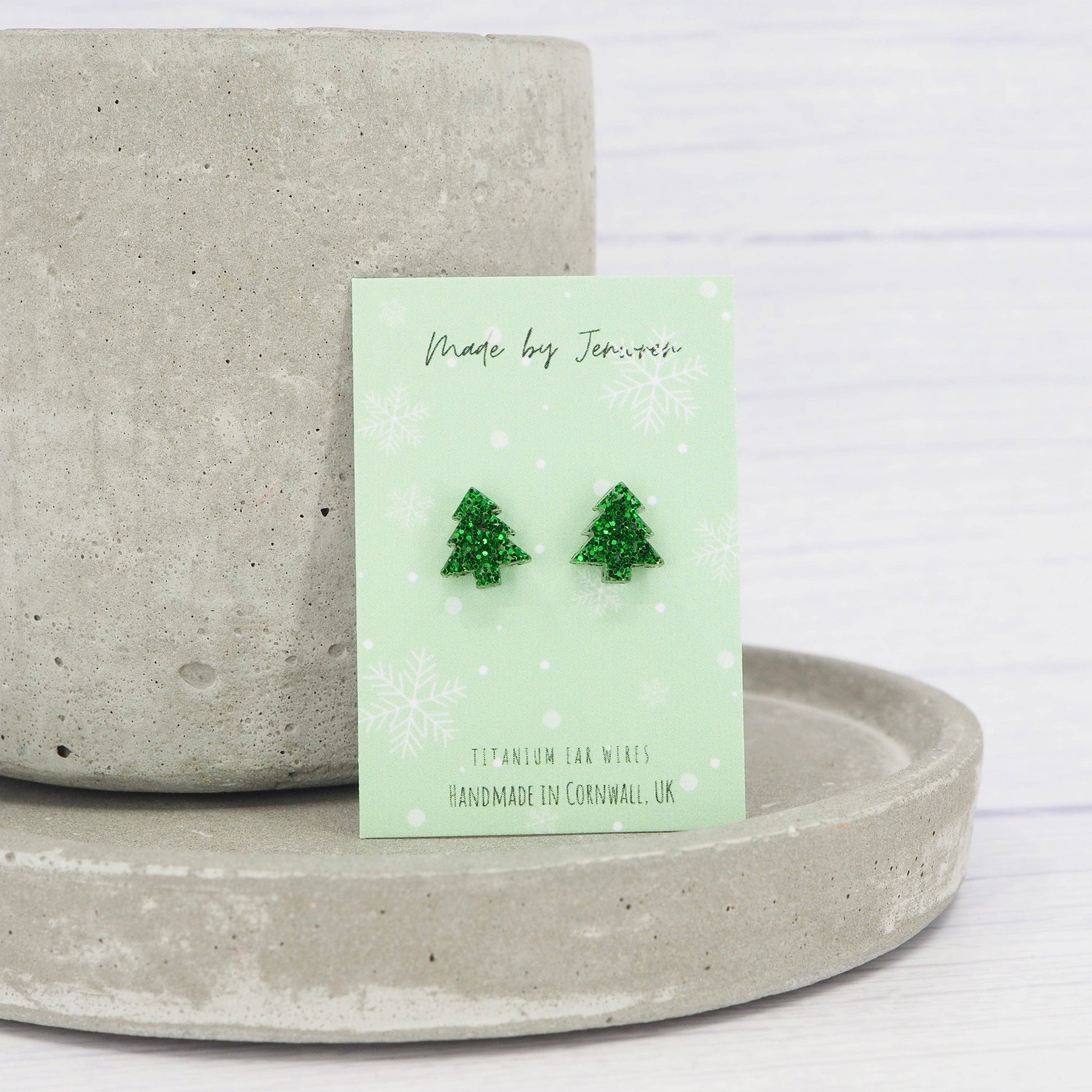 Tiny green glitter Christmas tree studs, perfect for a subtle seasonal nod.