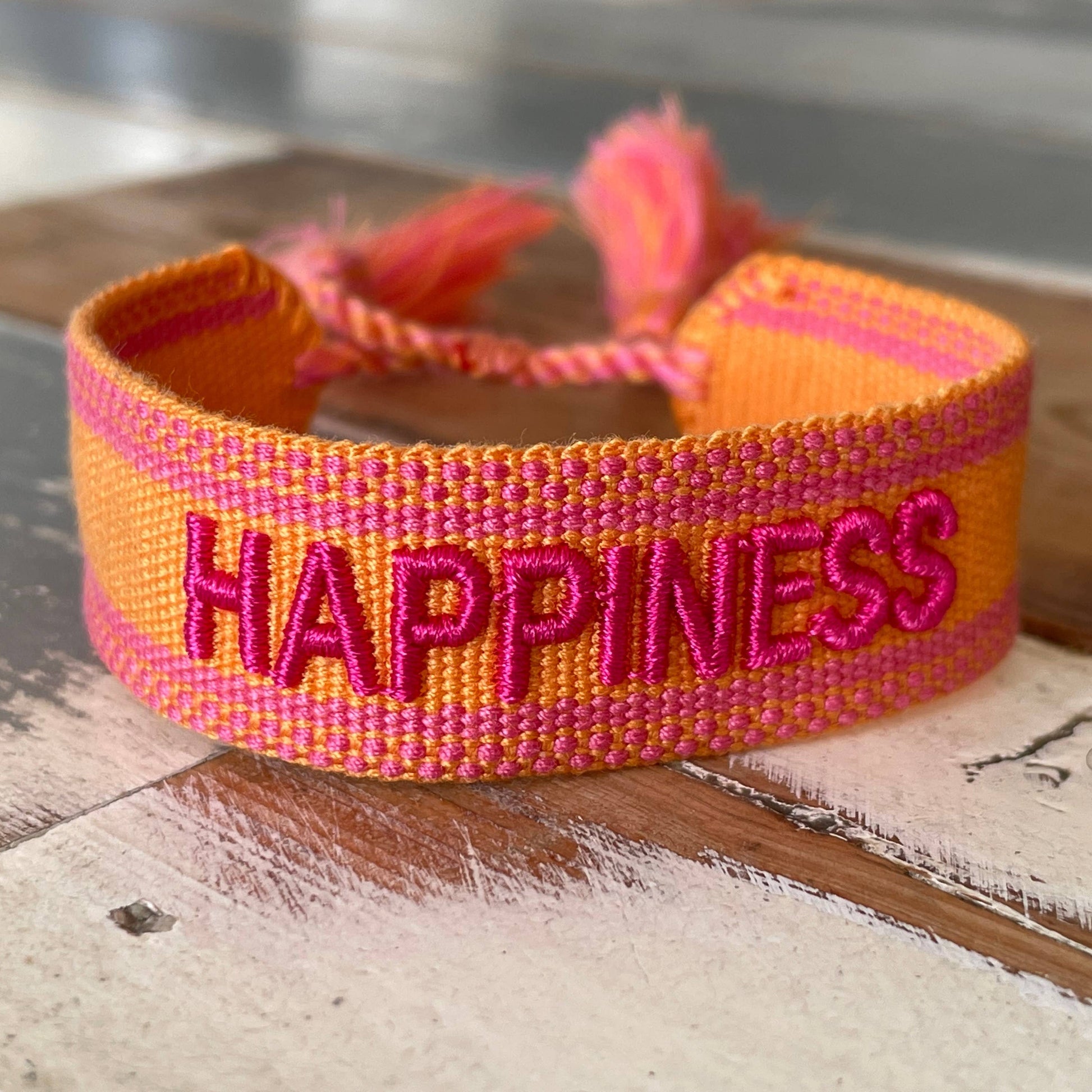 'Happiness' statement message woven bracelet with raised embroidered letters. A fun way to incorporate positive messaging into your everyday life.