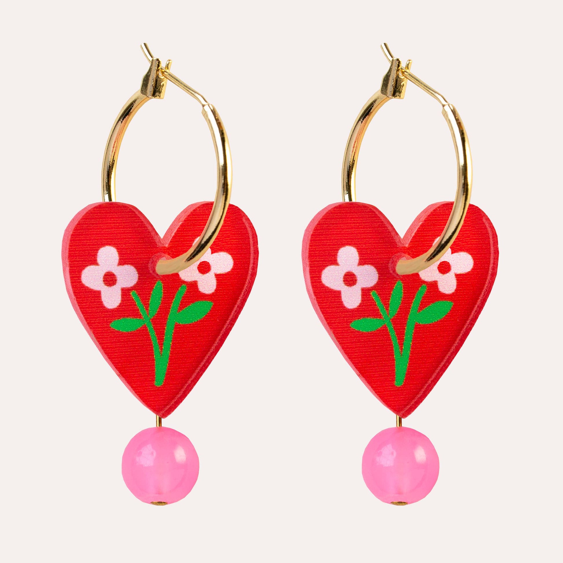These sweet heart earrings feature an illustrated floral heart charm paired with a soft pink glass bead that gently sways from a gold-plated hoop, adding playful movement and charm.