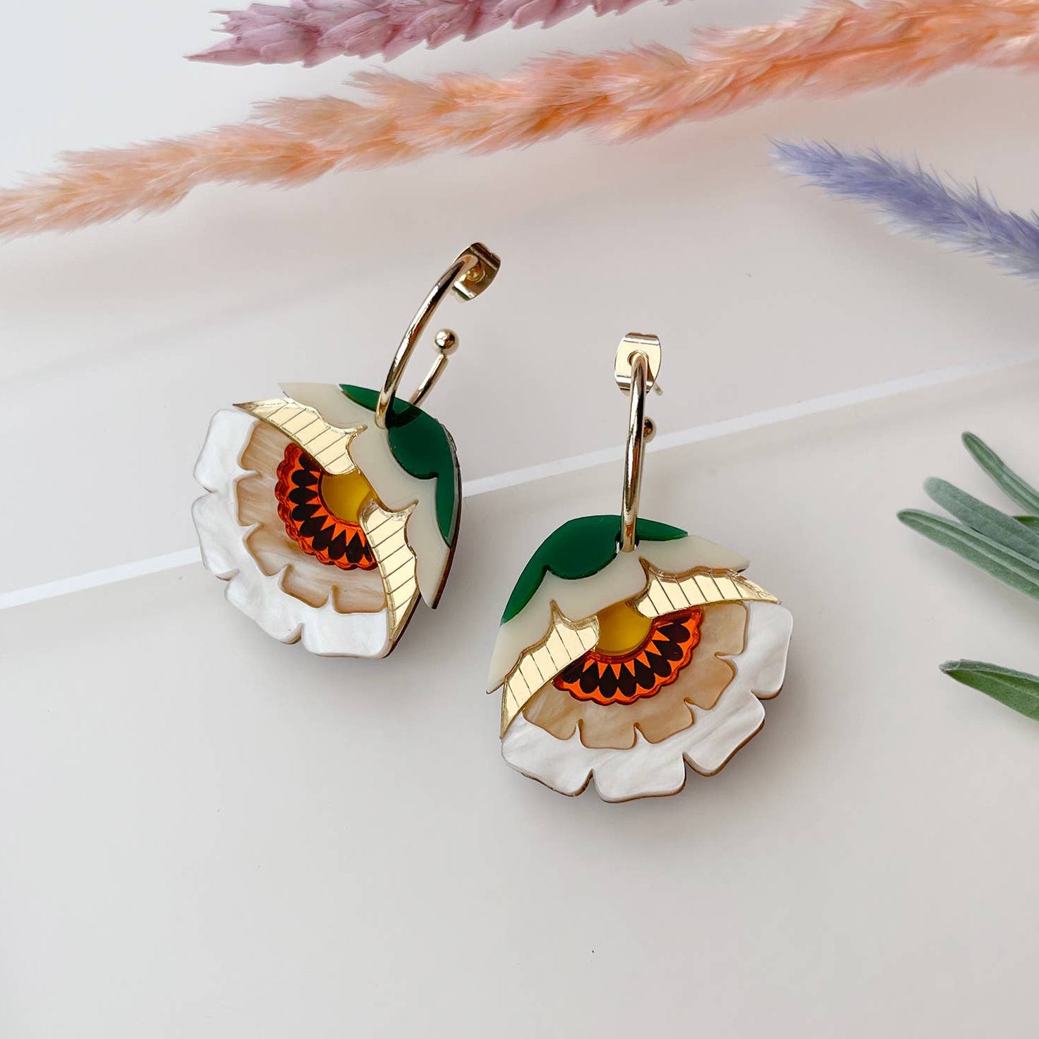 Add a burst of colour to your look with the Isobel Floral Hoop Earrings in Caramel. Featuring marbled pearl and caramel acrylic with yellow accents, these hoops are bold, intricate, and full of character. Designed to pair perfectly with the Isobel Necklace in Sunset, they also make a striking statement on their own.
