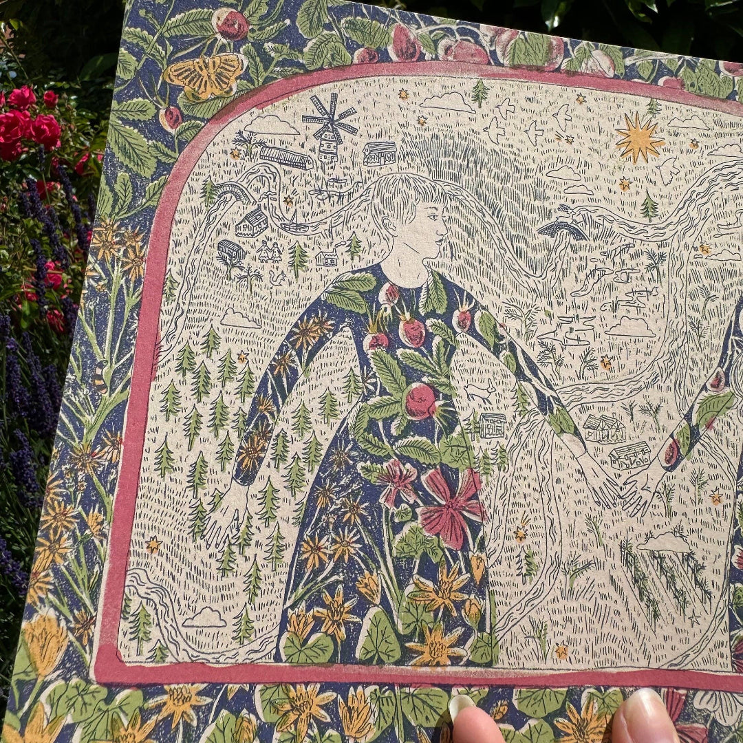 The print depicts two people facing each other surrounded by an orchard, windmill, oast houses, cottages and cabins, boats, the sea, rivers, fenland, forest, a squirrel, a rabbit, birds, the sun, an avocet, a horse and a deer walking over the bridge. The plants include lesser celandine, rose hips, ragwort, mallows, plums, apples and teasels.