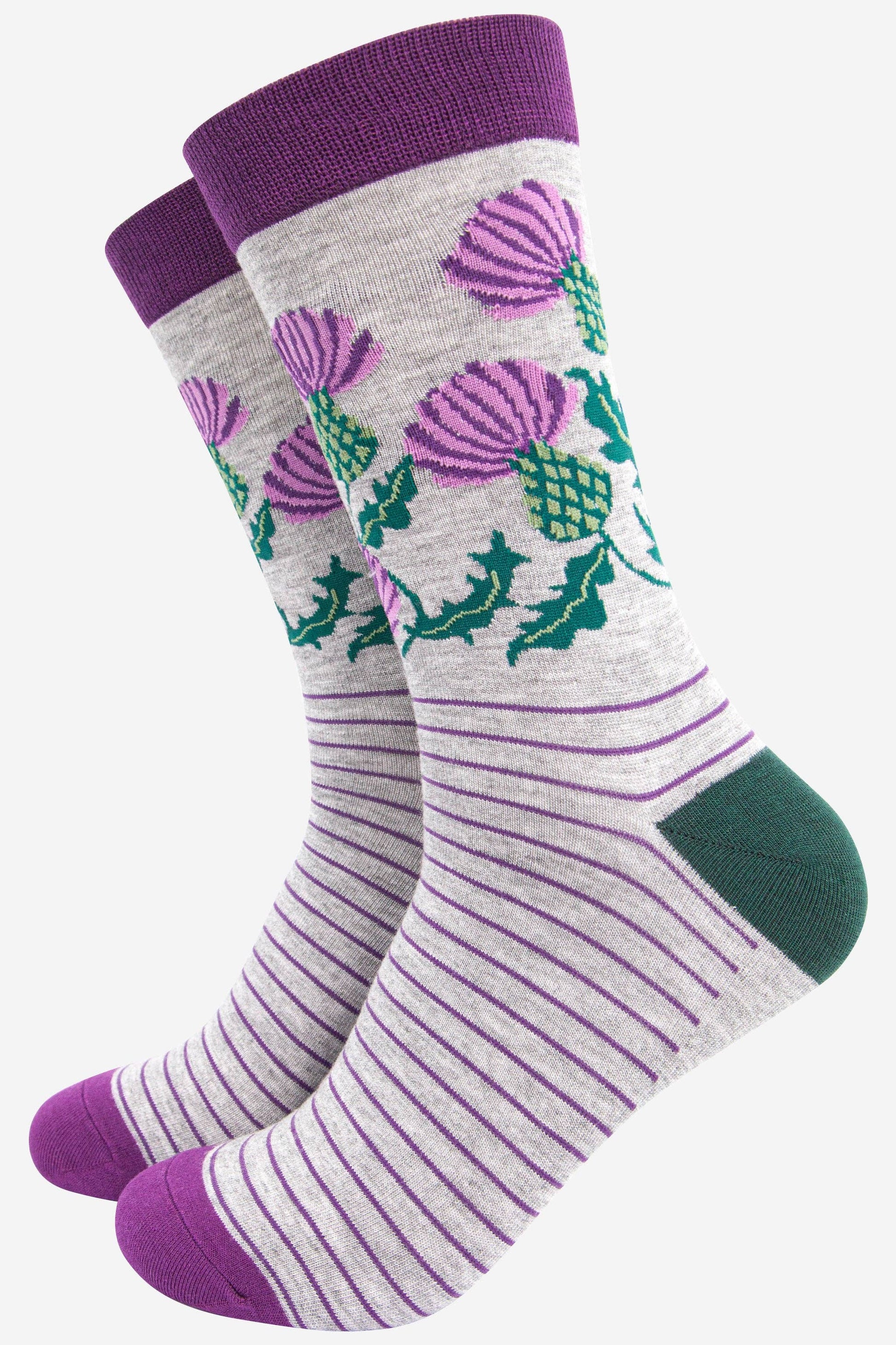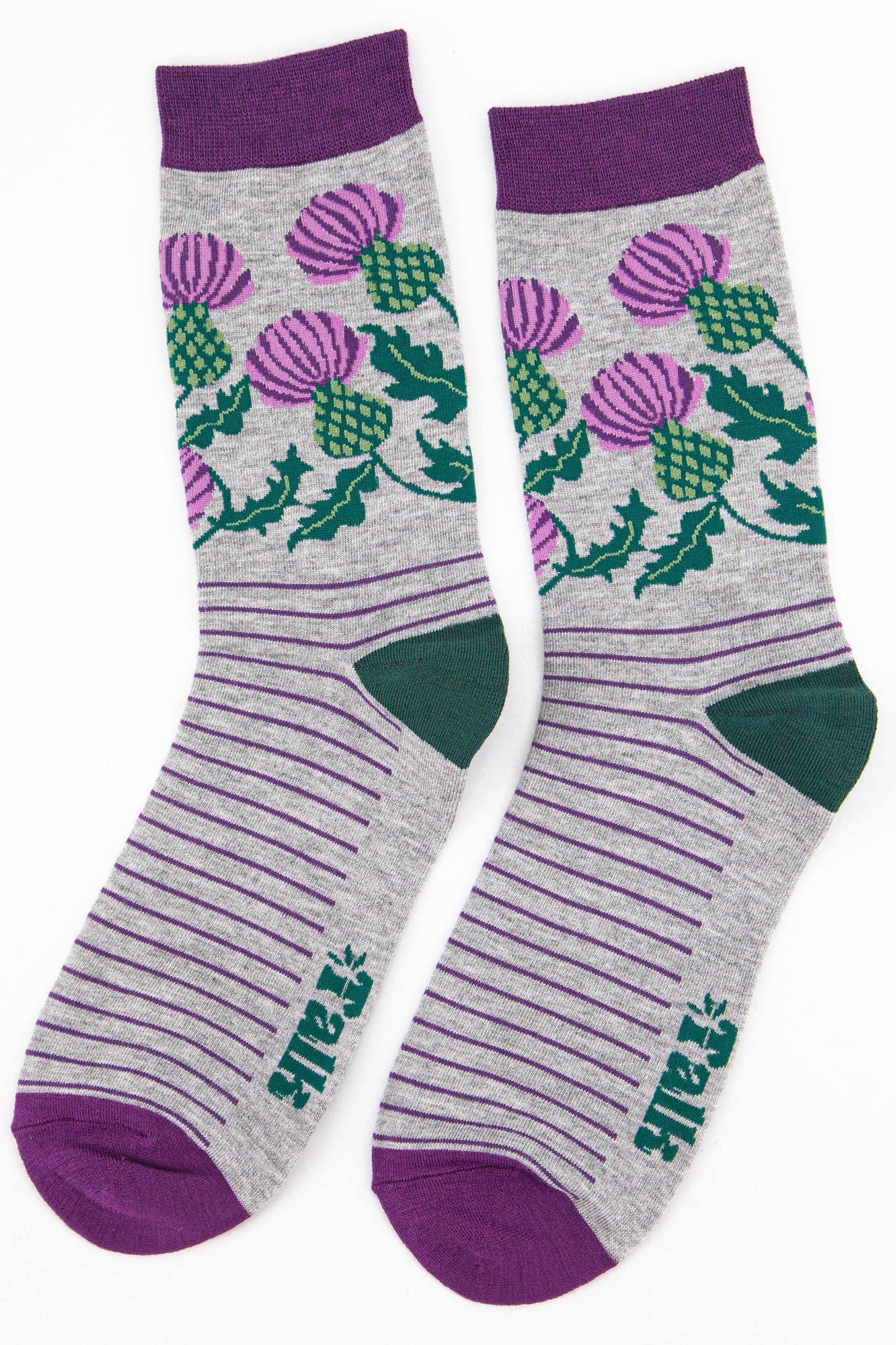 Crafted from naturally breathable bamboo these ankle socks feature scottish thistles and stripes.