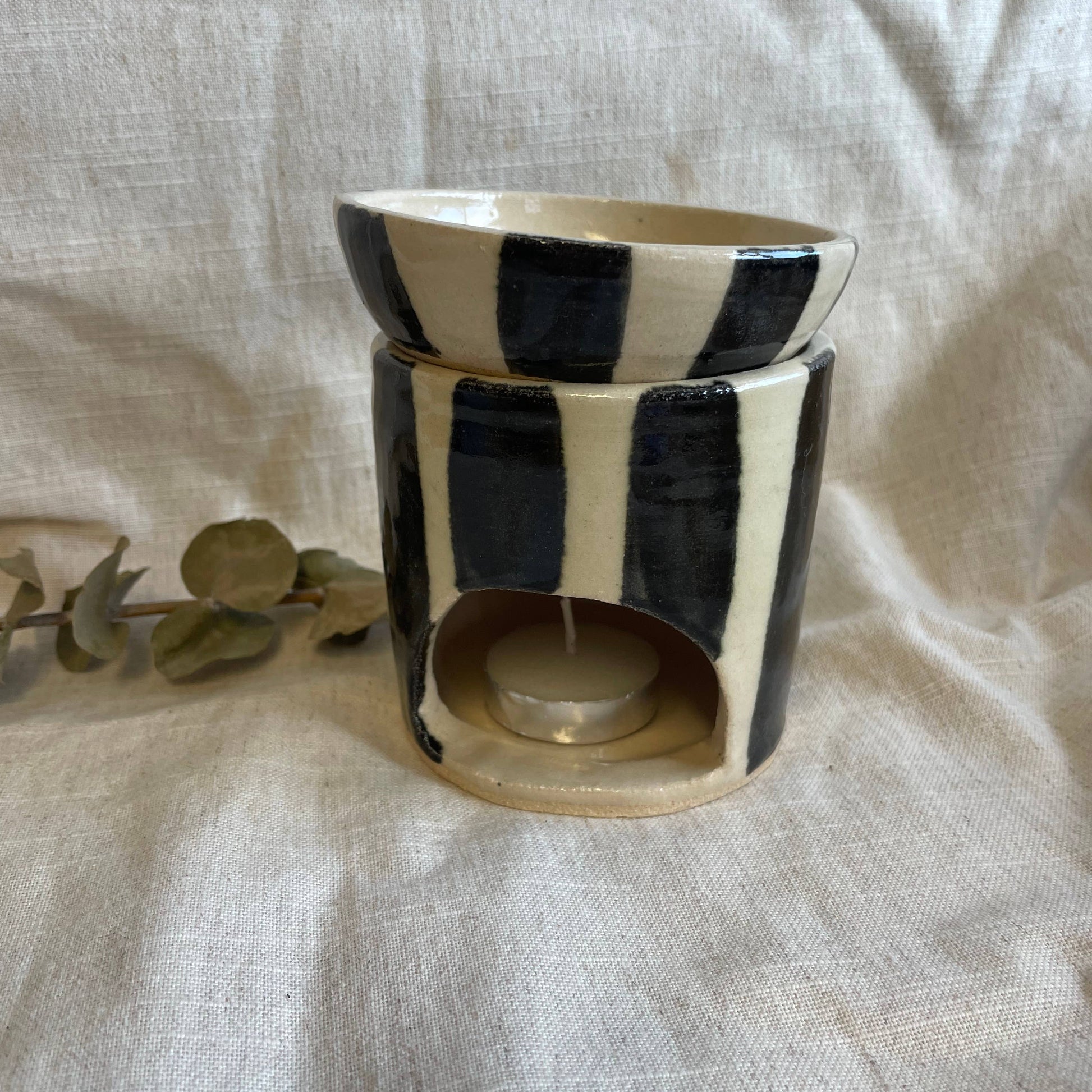 Create a moment of calm in your home with this hand-thrown ceramic wax burner. Simply decorated with bold painterly stripes,this piece is designed to fill your space with soothing scent and gentle light.