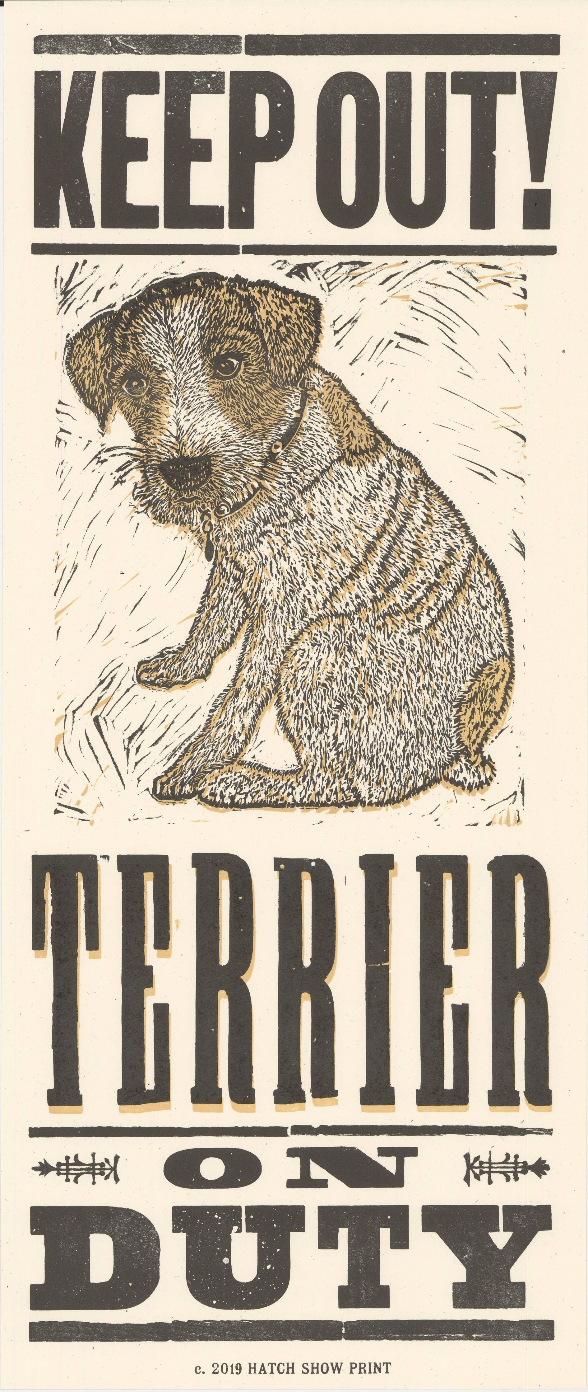 A hand-carved two colour print of a terrier accompanied by antique wood print lettering from the team at Hatch Show Print in Nashville TN.