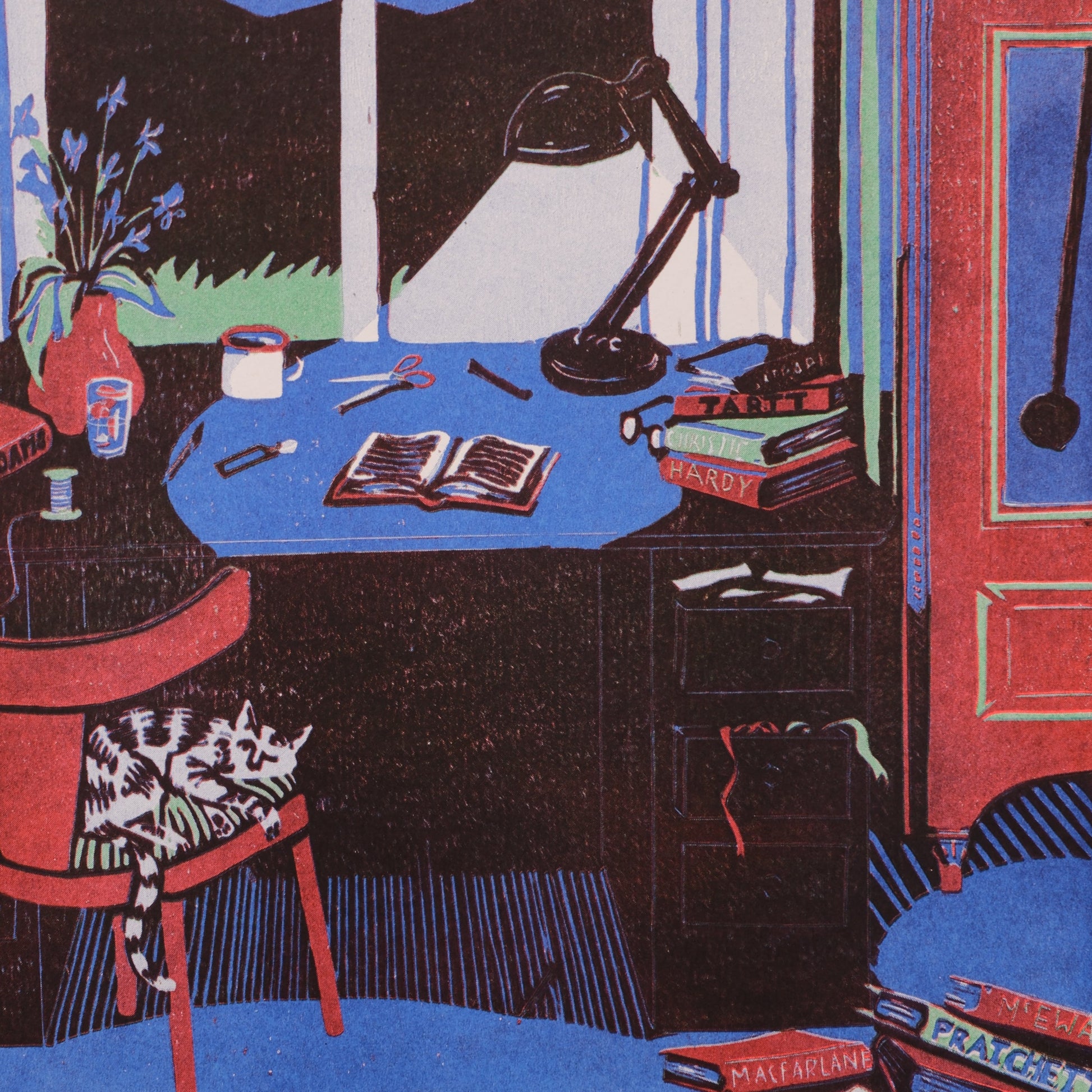 In the stillness of a library, surrounded by the classics, a cat curls up on it's owners chair in this cosy lino cut illustration.