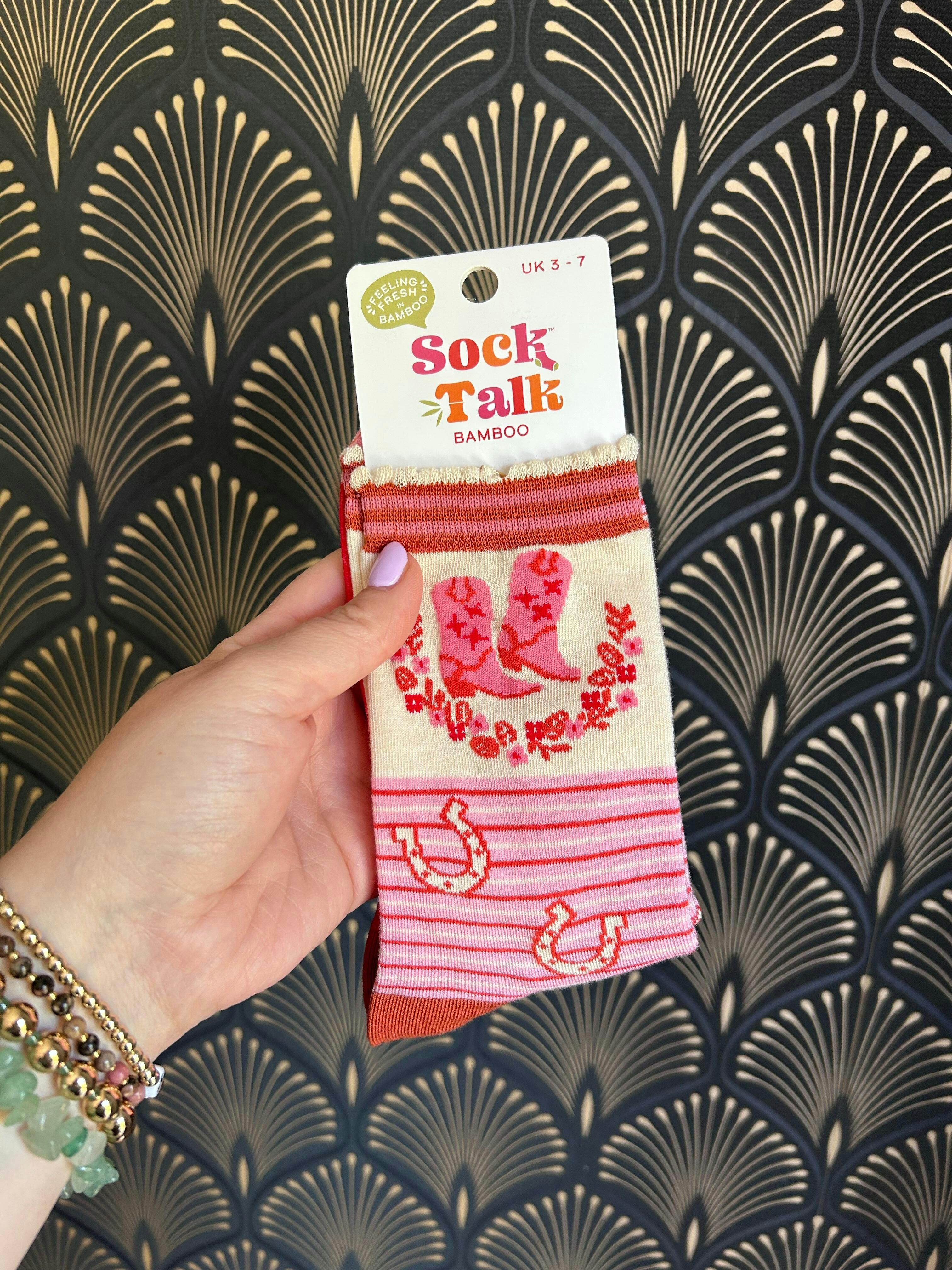 Wild west themed ankle socks feature cowboy boots, a floral wreath and classic pinstripes.
